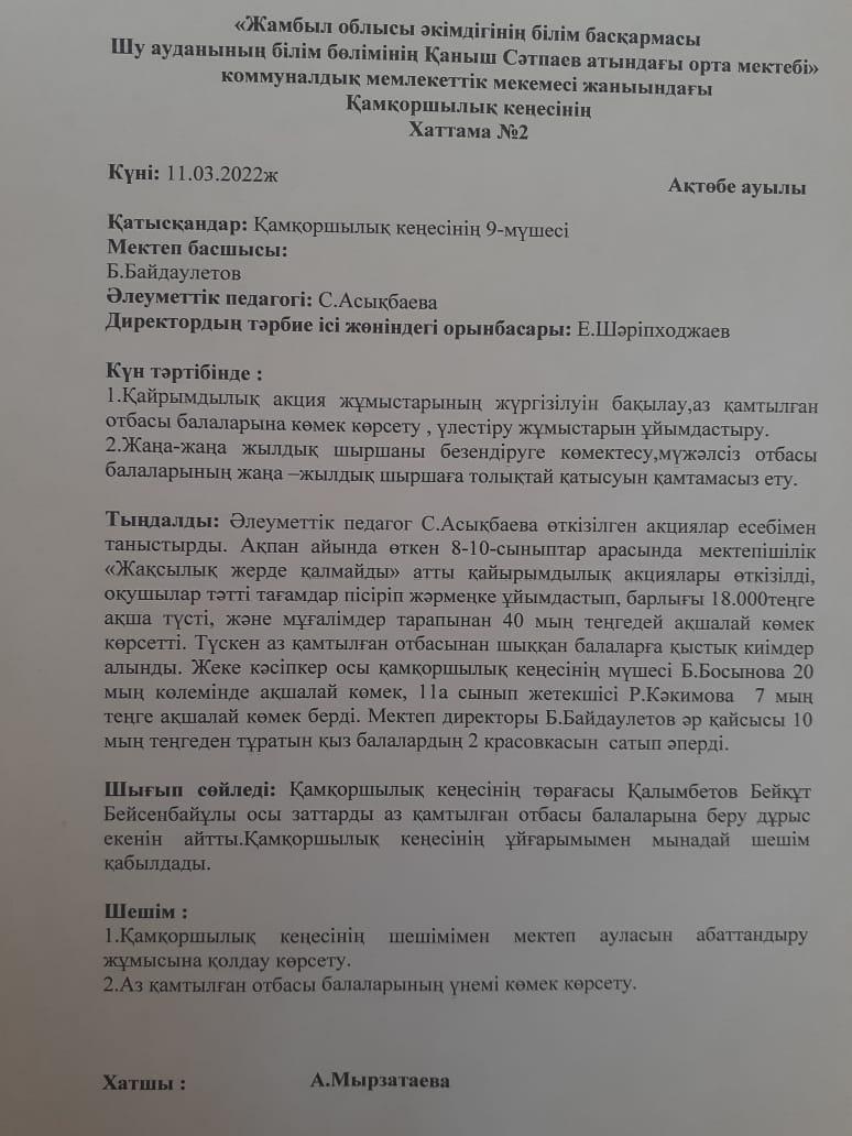 Қамқоршылық кеңес №2 хаттама » Қ.Сатпаев атындағы орта мектеп